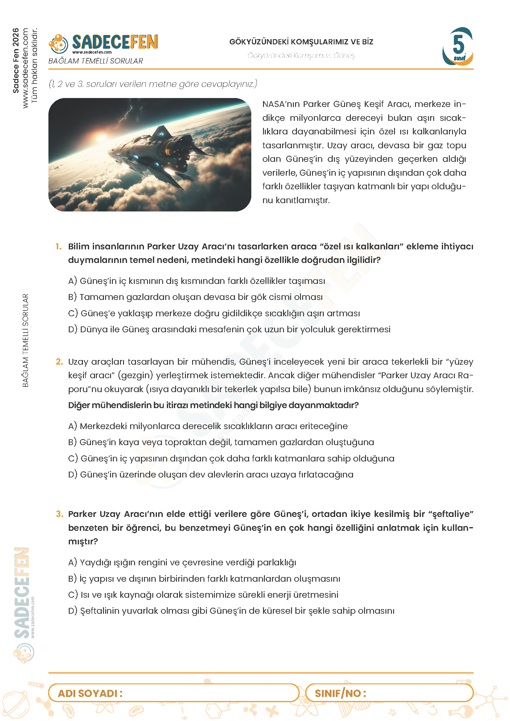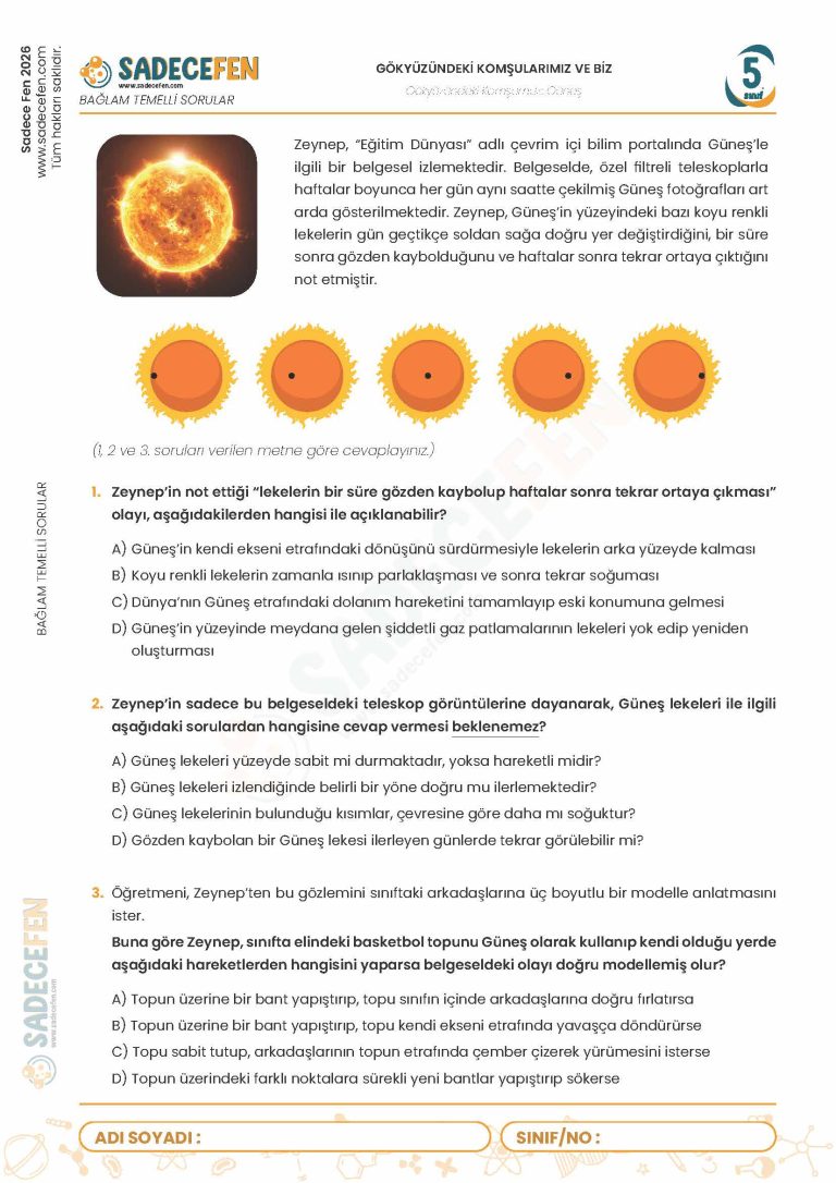 5. Sınıf Gökyüzündeki Komşumuz: Güneş Bağlam Temelli Sorular (BTS)