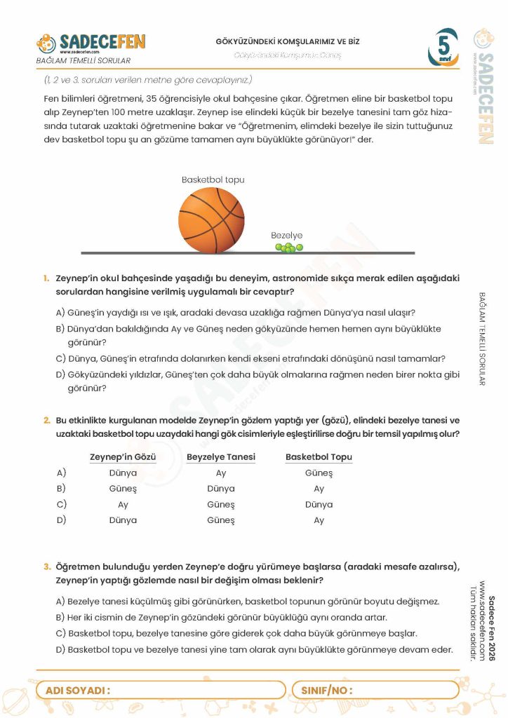 Çeldirici Mantığı: Öğrencilerin sadece okuduğunu anlama değil, üç boyutlu düşünme becerisini ölçer. Bakış açısının Dünya, küçük ve yakın olan cismin Ay, büyük ve uzak olan cismin ise Güneş olduğunu eşleştirebilmeleri gerekir. Eşleştirme sorularında şıkların dizilimi, rastgele tahminleri önleyecek şekilde (Güneş ve Ay’ın yerlerinin karıştırılması gibi kavram yanılgılarına göre) ayarlanmıştır.