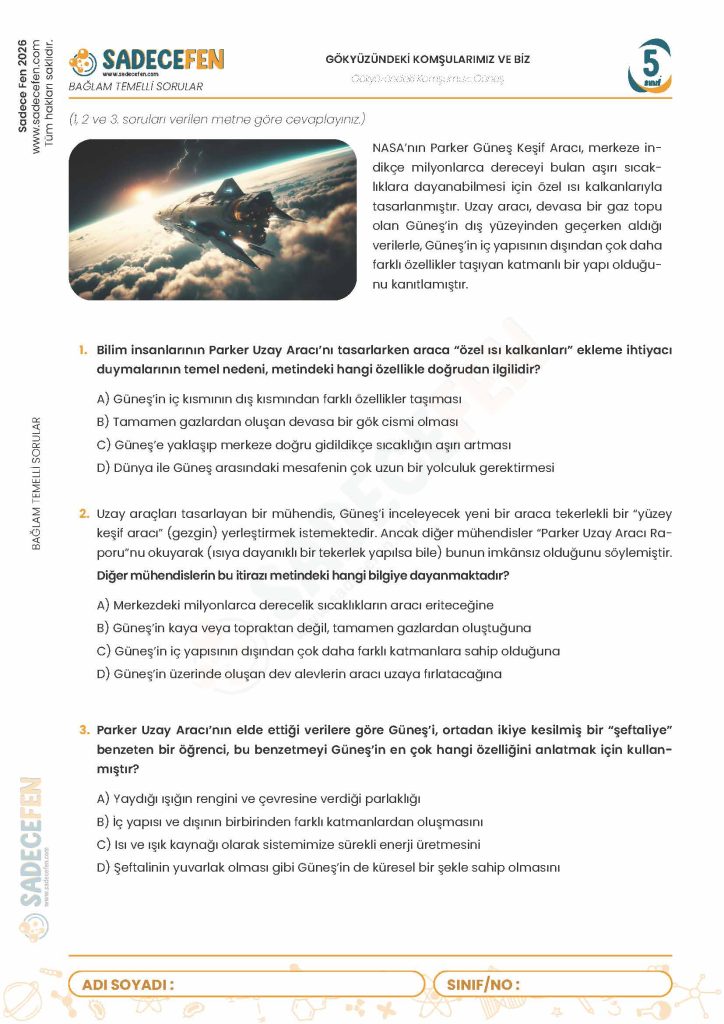 Çeldirici Mantığı: Bu soru, öğrencinin okuduğu metindeki bir “mühendislik çözümünü” (ısı kalkanı), bir “bilimsel olguya” (merkeze inildikçe artan sıcaklık) bağlamasını ister. Diğer şıkların hepsi metinden çıkarılabilecek veya doğru olan bilgilerdir ancak “ısı kalkanının” varlık nedenini açıklamazlar. Öğrencinin seçici dikkatini ve neden-sonuç kurma becerisini ölçer.